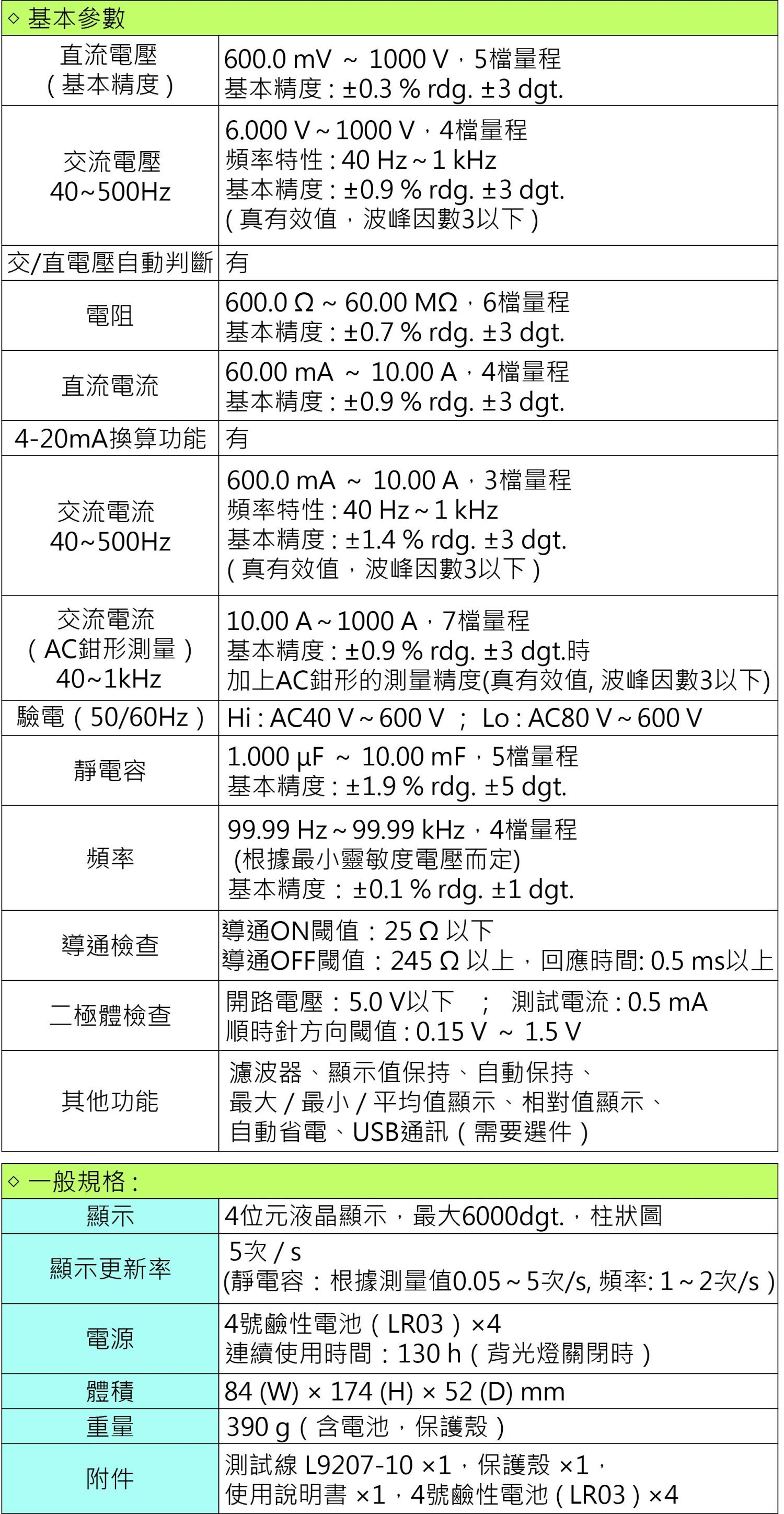 ▪ DC V基本精度±0.3%,AC V的頻率特性40Hz~1kHz