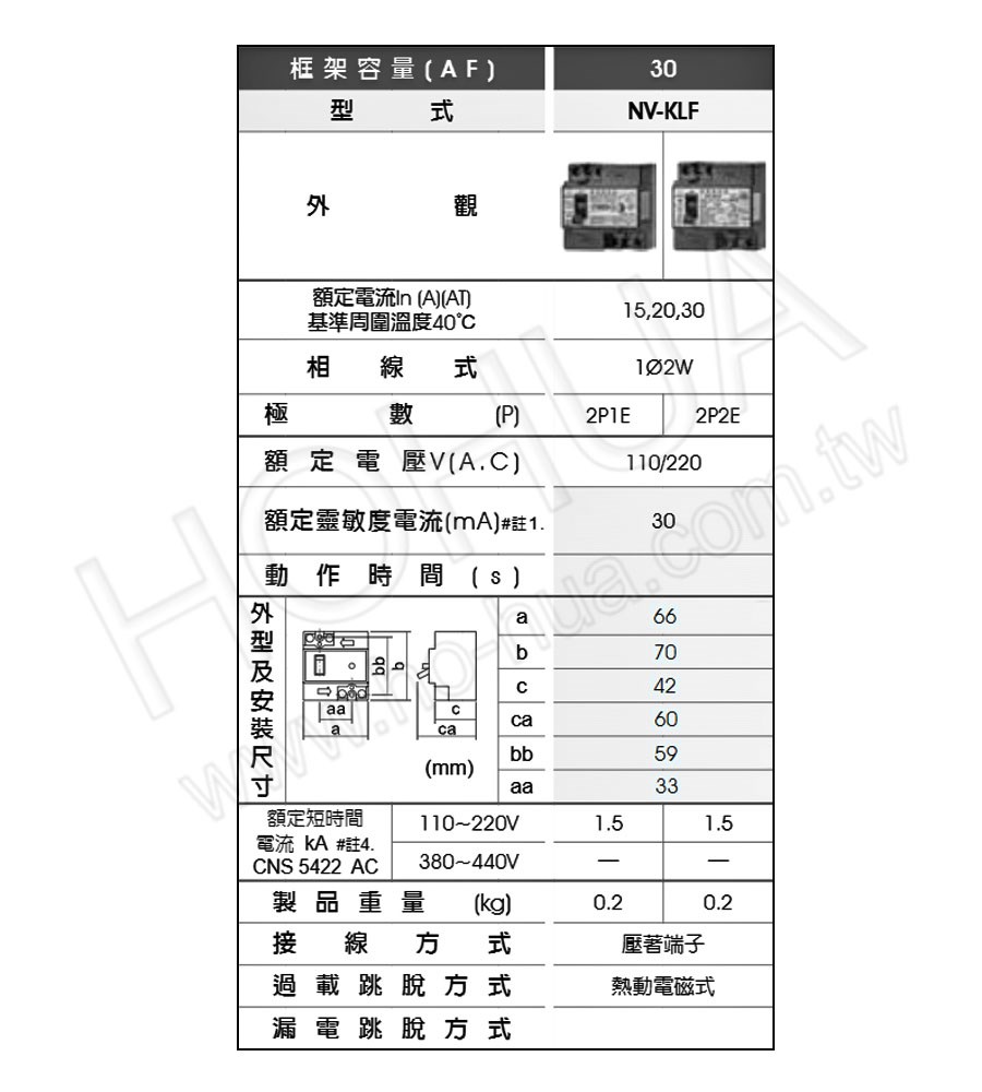 ▪ 短時間耐電流容量 : Ic 2P2E 110~220V / 1.5KA (sym)