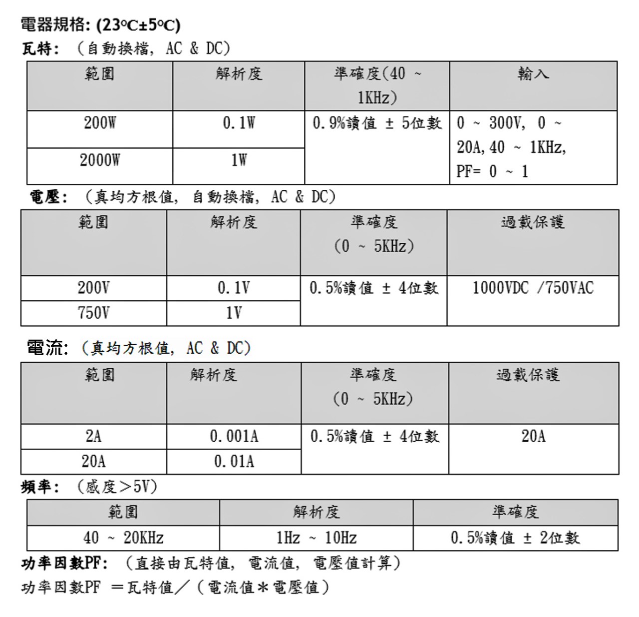 ▪ 可顯示功率因數(PF)及伏安容量值,方便改善功率因數及設備伏安容量之量測