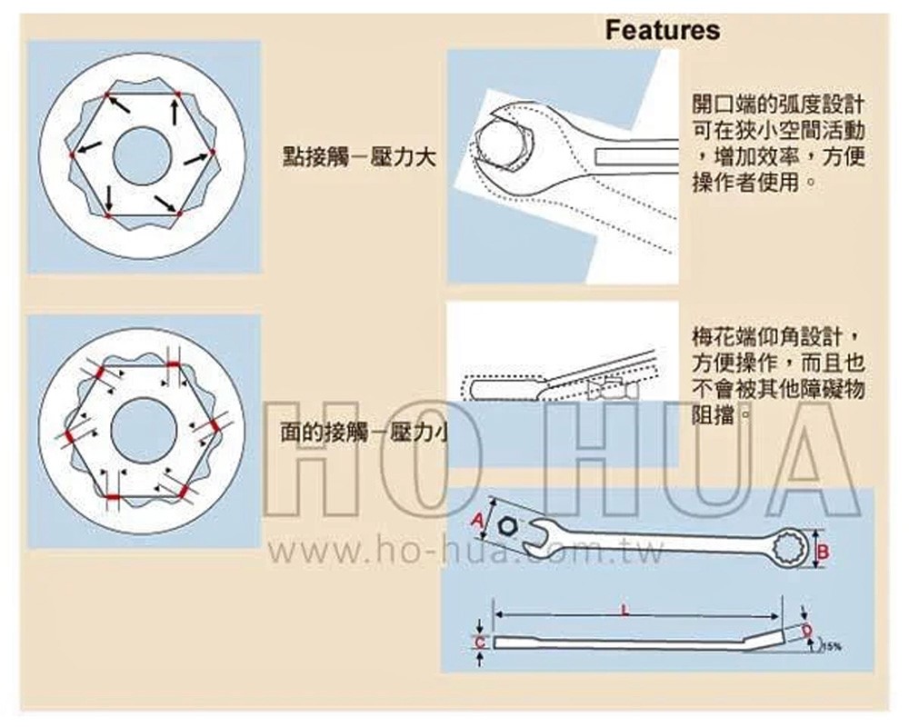 ▪ 梅花端內圓角的設計,取代傳統式直角,可以增加與被旋轉螺母的接觸面積,由"點"的接觸,改成"面"的接觸,不但可增加20%的扭力,也可保護被旋轉螺母不致於在用力過程中受損延長工具的壽命