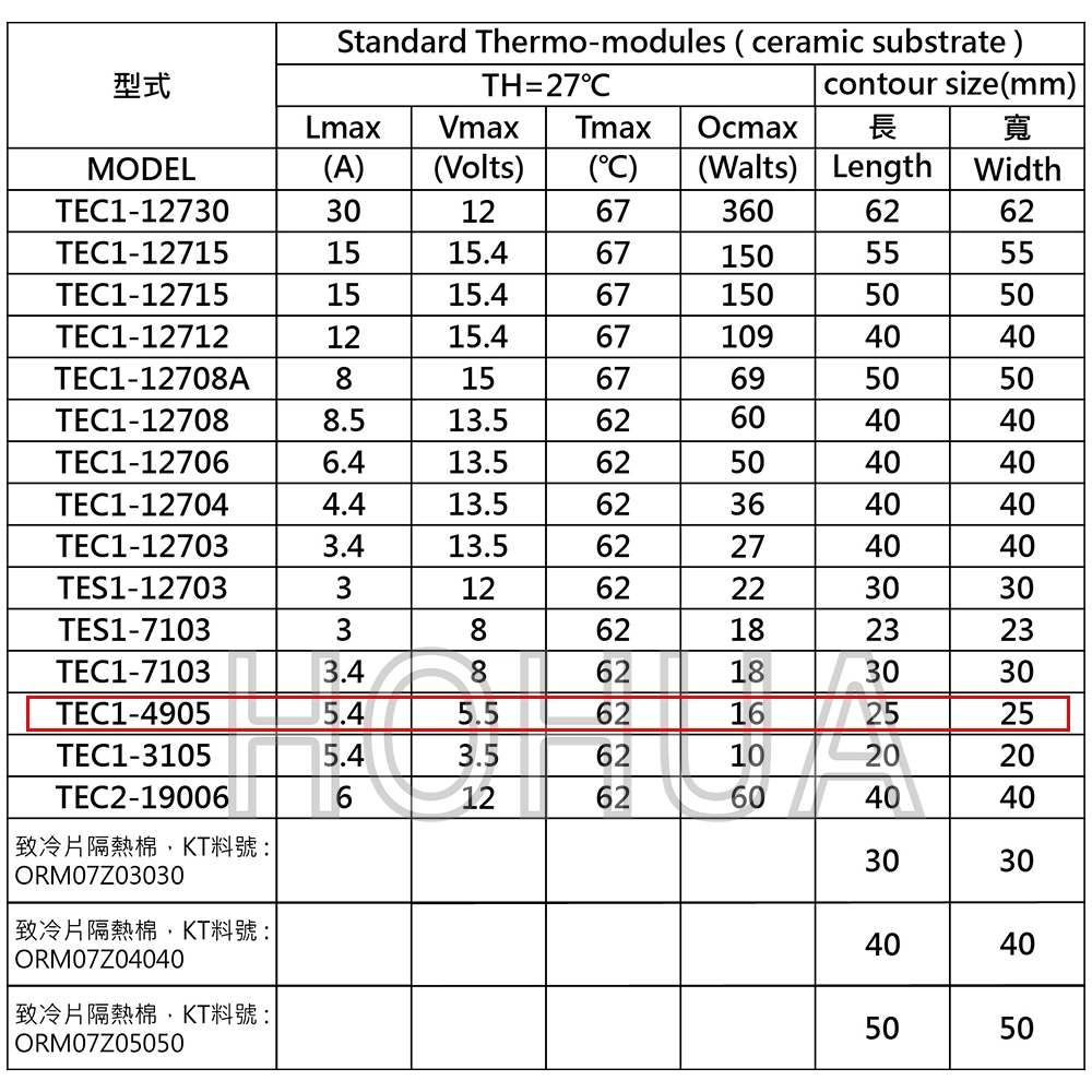 25*25*4致冷晶片 ( 5.5V5.4A16W ) TEC1-4905