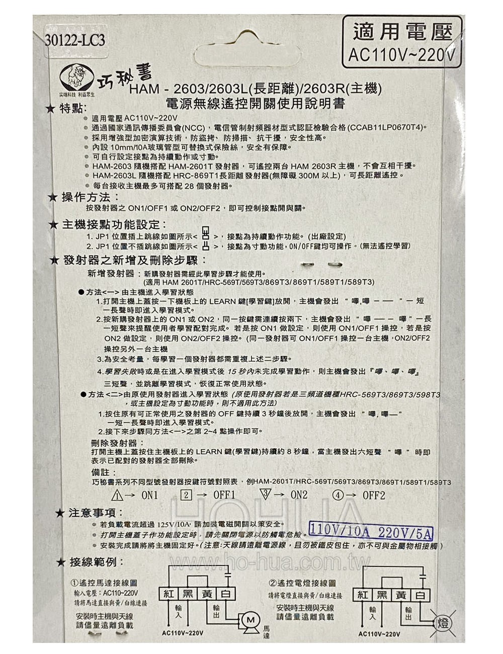 6. HAM-2603隨機搭配HAM-2601T發射器,可遙控兩台HAM-2603R主機,不會互相干擾