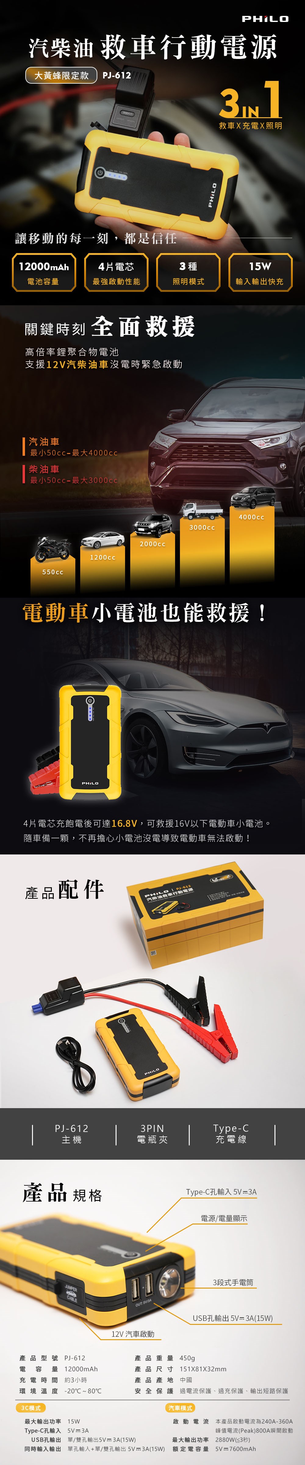 • 一機三用 : 汽車緊急啟動、行動電源、手電筒