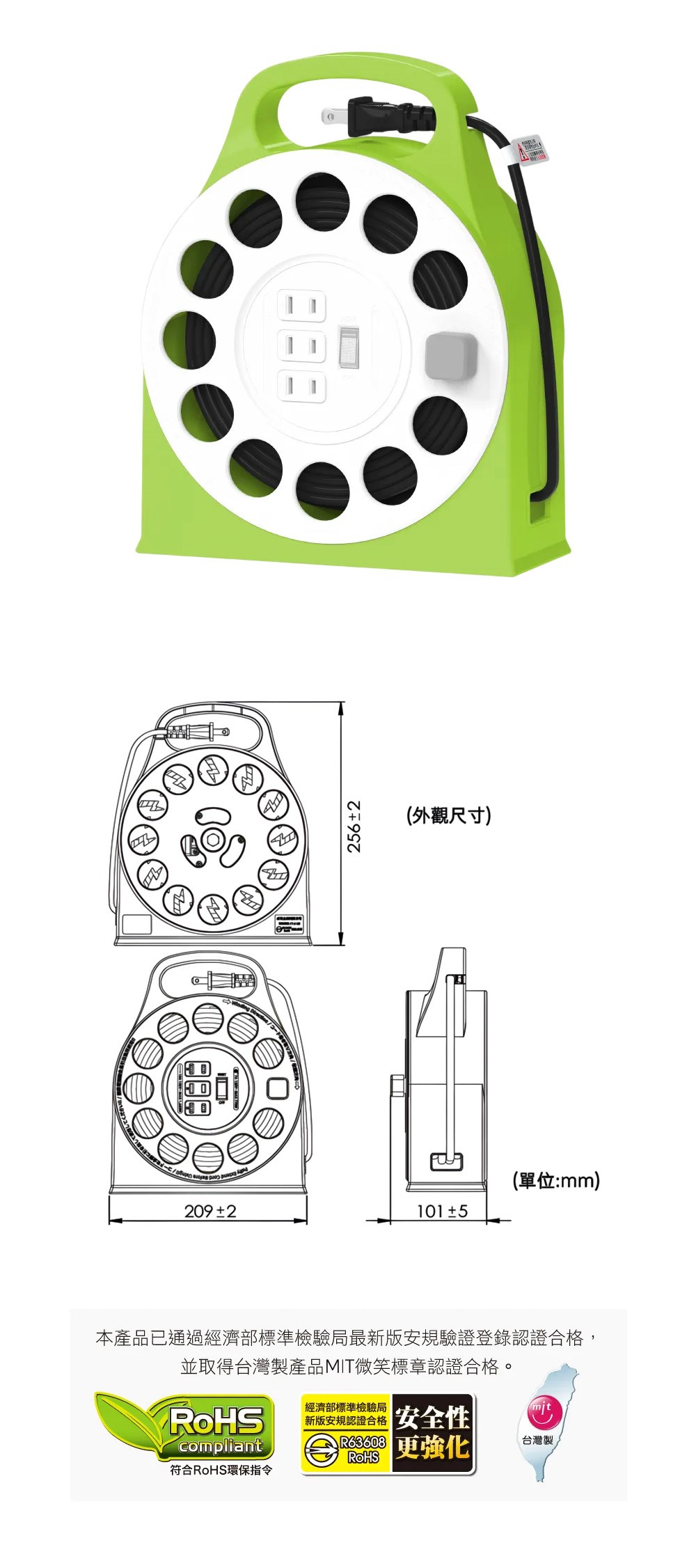 • 電流過載+線軸過熱,雙重安全自動斷電保護 ( 過載自動斷電保護開關、捲線軸搭載過熱自動斷電保護 )